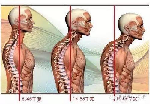 1. 头部前倾的姿势会引起反常的杠杆作用,从而给脊柱增加13.64千克的负重。这使得脊柱变的弯曲。